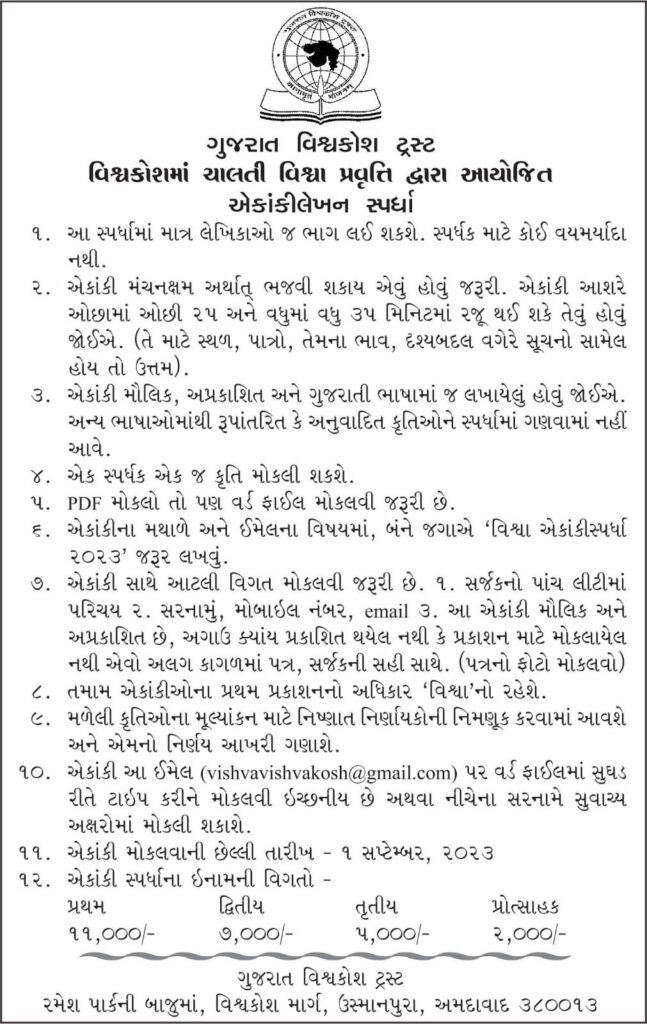 એકાંકી મોકલવાની છેલ્લી તારીખ 1 સપ્ટેમ્બર 2023