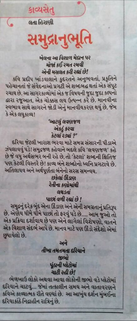 કવિ પ્રદીપ ખાંડવાલાને કુદરતને અનુભવતાં, પ્રકૃતિને પહેચાનતાં…. જે સંવેદનાઓ પ્રગટી…. એ શબ્દબદ્ધ થતાં એક સંપુટ રચાય છે. આ સાગરકાવ્યોમાં એક જ વિષયની જુદા જુદા કલ્પનો દ્વારા રજૂઆત, એક ચોક્કસ લય ઉત્પન્ન કરે છે. વાત સાગરની છે જેમાં લીલા માનવીની પણ છે. માનવીની પ્રવૃત્તિ સાથે, માનવીના સ્વભાવ સાથે સાગરને જોડી એનું માનવીયકરણ થયું છે, જેમ કે એક લઘુકાવ્ય!