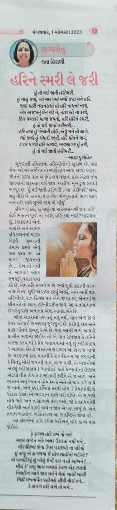 હરિને સ્મરી લે જરી ~ લતા હિરાણી * કાવ્યસેતુ 447 > દિવ્ય ભાસ્કર > 1.8.23