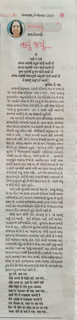 તારું જવું – લતા હિરાણી * કાવ્યસેતુ 448 > દિવ્ય ભાસ્કર > 8.8.23