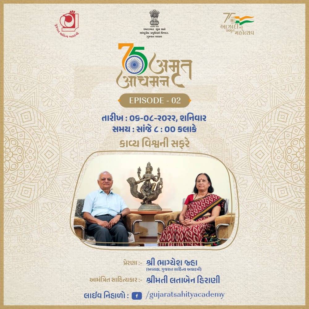 2.ગુજરાત સાહિત્ય અકાદમીના અધ્યક્ષશ્રી ભાગ્યેશ જહા દ્વારા ‘કાવ્યવિશ્વની સફર’ વિડીયો મુલાકાત લેવાઈ અને તા. 6 ઓગસ્ટ 2022ના રોજ સાહિત્ય અકાદમીના ફેસબુક પેજ પરથી એનું પ્રસારણ થયું.