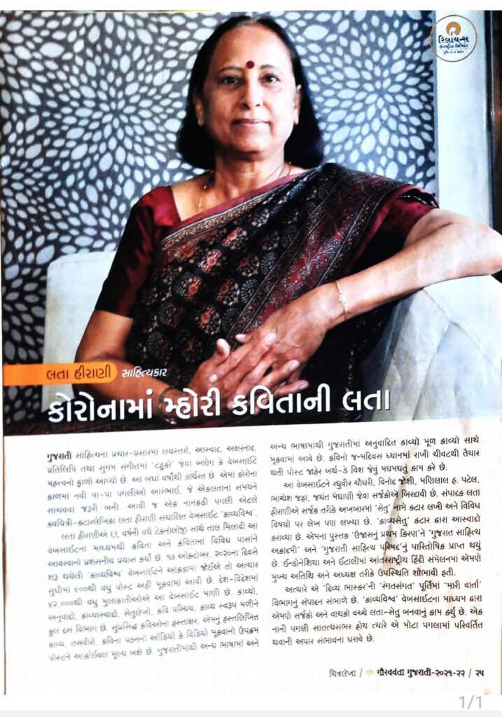 1.ચિત્રલેખા દ્વારા પ્રગટ થતી ‘2021ના ગૌરવવંતા ગુજરાતીઓ’ની શ્રેણીમાં મને એટલે કે ‘કાવ્યવિશ્વ’ને સ્થાન મળ્યું. https://www.kavyavishva.com/?p=3148