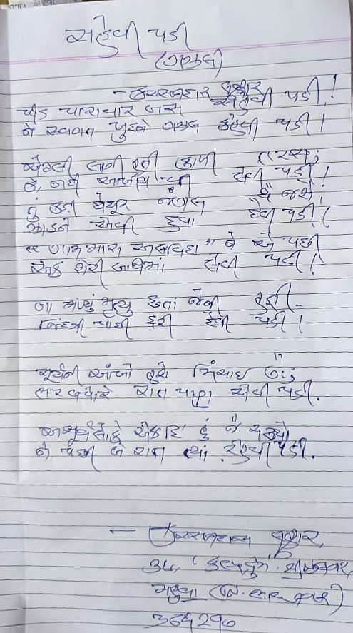 કરસનદાસ લુહારના હસ્તાક્ષરમાં કાવ્ય 1 Comment / કાવ્ય, સંચય / 25/08/2024 🥀🥀 Like this:Like Loading... Related Leave a Comment Cancel ReplyYour email address will not be published. Required fields are marked *Type here.. Name Email Website Save my name, email, and website in this browser for the next time I comment. Notify me of follow-up comments by email. Notify me of new posts by email. Δ