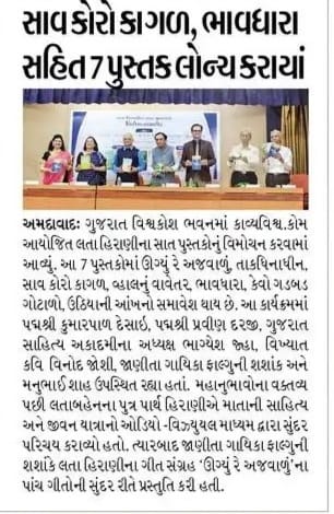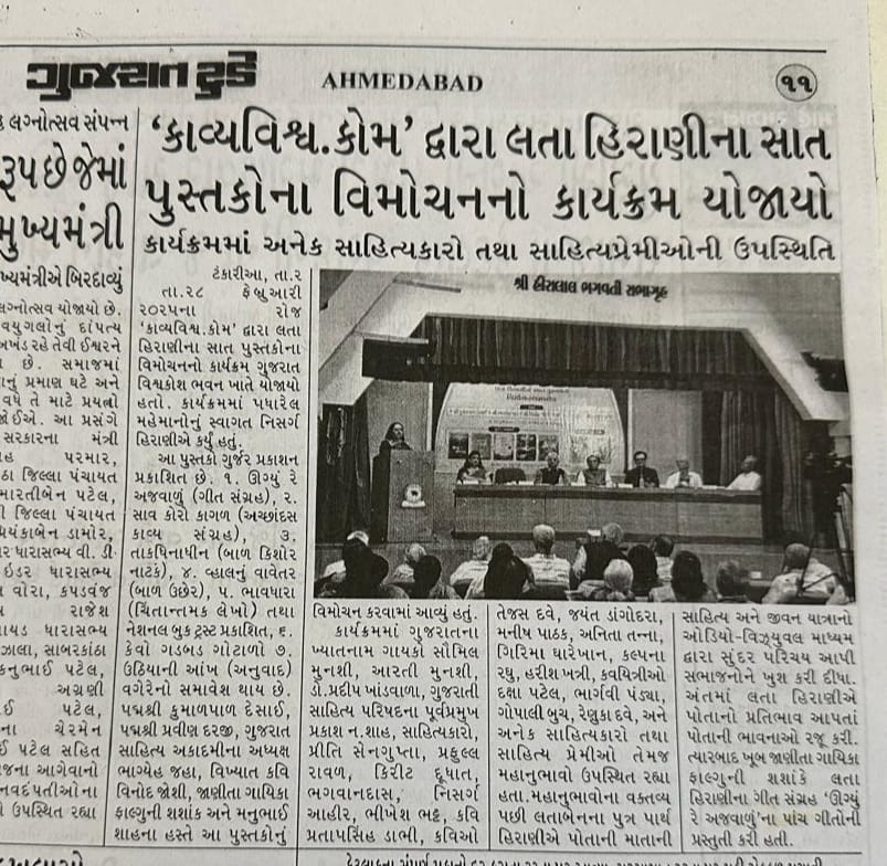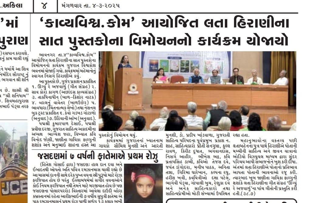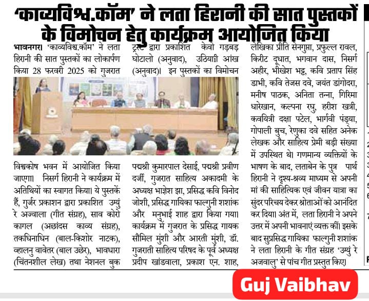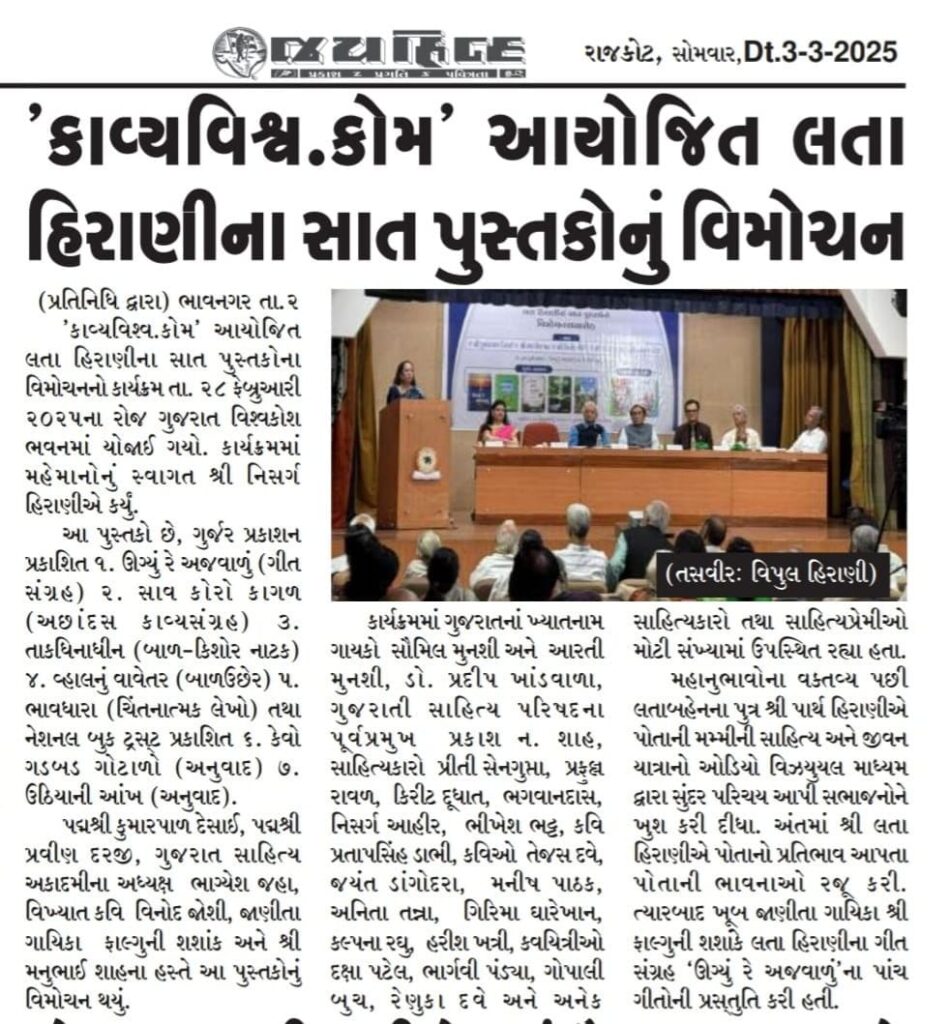 ‘કાવ્યવિશ્વ.કોમ’ આયોજિત લતા હિરાણીના સાત પુસ્તકોના વિમોચનનો કાર્યક્રમ તા. 28 ફેબ્રુઆરી 2025ના રોજ ગુજરાત વિશ્વકોશ ભવનમાં યોજાઇ ગયો.
