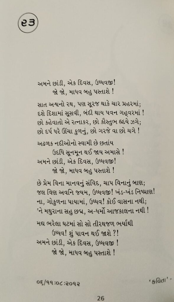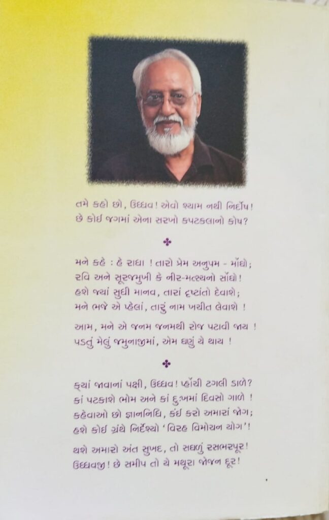 “પ્રથમ ઉદ્ધવગીતનું અવતરણ થયું ત્યારે મને કલ્પના નહોતી કે બીજાં 57-58 ગીતો આવશે…. ઉદ્ધવજીની વ્રજયાત્રા અને પ્રત્યાગમનનું આલેખન કરતા શ્લોકો જાણું છું. હિન્દીભાષામાં ‘ભ્રમરગીત’ કહેવાતાં આ વિષયના પદો-ગીતો રચાયા છે તેમ જ ગુજરાતીમાં પણ ઘણા કવિઓએ આવાં ગીતોની રચના કરી છે…. કિન્તુ એક જ સર્જકે આ વિષયના આટલાં ગીતો રચ્યાનું મને સ્મરણ નથી.”