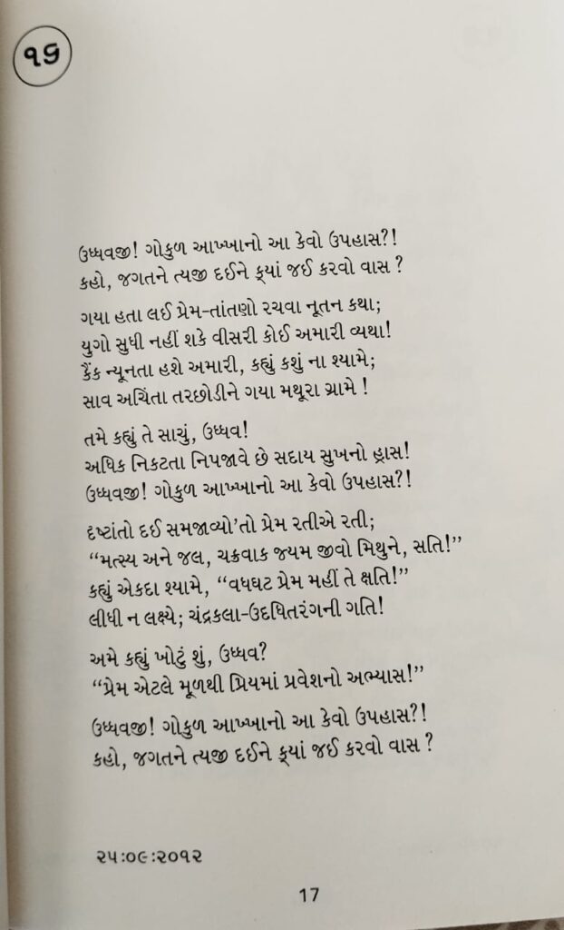 આ ગોપીગીતો છે, ઉદ્ધવને સંબોધાયેલા ગીતો છે. બે ગીતો પરંપરિત મનહર છંદમાં છે બાકીના બધાં જ ગીતો પરંપરિત કટાવમાં રચાયાં છે. એક જ ગીત જશોદાના મુખે અવતર્યું છે બાકીનાં ગીતો ગોપીમુખે અવતર્યા છે. જશોદામુખે અવતરેલું ગીત ‘કહે જશોદા: કહાન વિનાનું ગોકુળ ખાવા ધાય’માં કવિના શબ્દોમાં મળે છે, (રડતાં રડતાં જ લખાયું છે!) તમામ ગીતોમાંથી પસાર થતાં આંખ ભીંજાય નહીં તો જ નવાઈ !