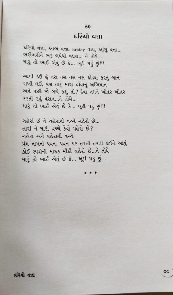 હું જ ક્રંદિત આર્દ્ર સ્વરમાં / હું જ વંદિત સાત સ્વરમાં / હું યુગોથી દૃશ્યપટ પર / હું નિરંતર હું ચિરંતન / ઇતિહાસ લઈ / ઇતિહાસ થઈ ઊભો છું / હું દરિયો છું.