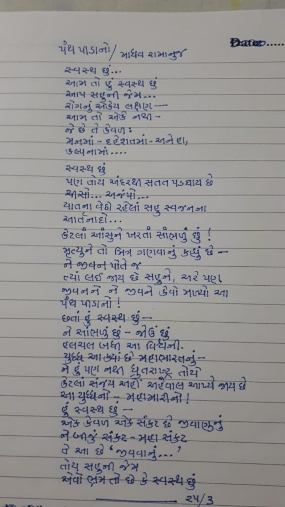 માધવ રામાનુજના હસ્તાક્ષરમાં કાવ્ય ‘પંથ પીડાનો’ 3 Comments / કાવ્ય, સંચય / 22/04/2025 Like this:Like Loading... Related 3 thoughts on “માધવ રામાનુજના હસ્તાક્ષરમાં કાવ્ય ‘પંથ પીડાનો’” સાજ મેવાડા 22/04/2025 at 1:20 pm ખૂબ જ સરસ રચના, ‘આમ તો હું સ્વસ્થ છું..’ દુઃખો વચ્ચે પણ સ્વસ્થ રહેવાનો ભ્રમ. Loading... Reply Anonymous 22/04/2025 at 6:54 pm વાહ! સરસ રચનાઓની સુંદર રજુઆત. સરયૂ Loading... Reply Leave a Comment Cancel ReplyYour email address will not be published. Required fields are marked *Type here.. Name Email Website Save my name, email, and website in this browser for the next time I comment. Notify me of follow-up comments by email. Notify me of new posts by email. Δ