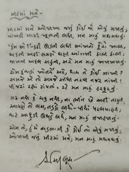 હસિત બૂચના હસ્તાક્ષરમાં કાવ્ય ~ મીટમાં મને 1 Comment / કાવ્ય, સંચય / 01/05/2025 Like this:Like Loading... Related 1 thought on “હસિત બૂચના હસ્તાક્ષરમાં કાવ્ય ~ મીટમાં મને” સાજ મેવાડા 02/05/2025 at 12:03 pm સ્મૃતિ વંદન, મને મારા કોલેજના સમયમાં એમના આશીર્વાદ મળ્યા છે. Loading... Reply Leave a Comment Cancel ReplyYour email address will not be published. Required fields are marked *Type here.. Name Email Website Save my name, email, and website in this browser for the next time I comment. Notify me of follow-up comments by email. Notify me of new posts by email. Δ