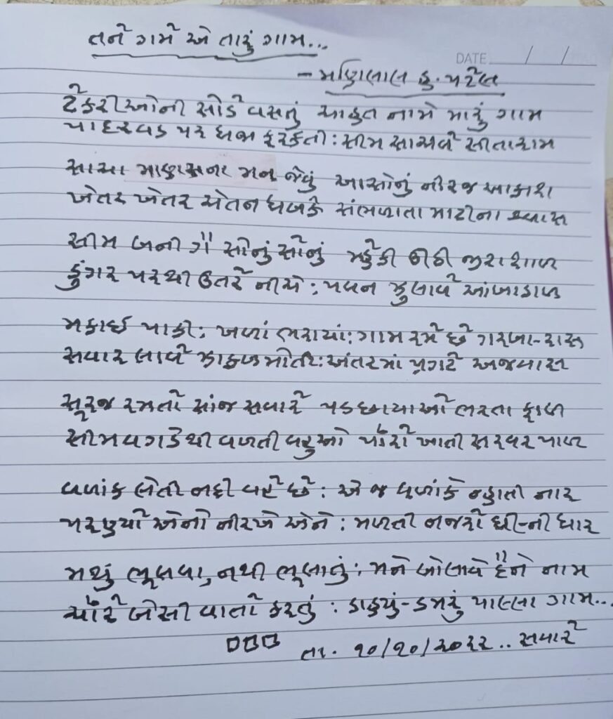 મણિલાલ હ. પટેલના હસ્તાક્ષરમાં કાવ્ય ~ તને ગમે એ તારું ગામ 6 Comments / કાવ્ય, સંચય / 08/11/2023 Like this:Like Loading... Related 6 thoughts on “મણિલાલ હ. પટેલના હસ્તાક્ષરમાં કાવ્ય ~ તને ગમે એ તારું ગામ” Anonymous 16/12/2022 at 2:12 pm મણીલાલનું આખું ગામ ચાક્ષુસ થઈને આવે છે ઉપરાંત પ્રણયનાં રંગ પણ કવિએ પૂર્યા છે. સરસ કાવ્ય.. Loading... Reply Sarla Sutaria 18/12/2022 at 5:18 pm આખું ગામ અને ગામની પ્રકૃતિ તાદ્રશ્ય થઈ ગઈ. વાહ કવિરાજ 👌👏 Loading... Reply 'સાજ' મેવાડા 10/11/2023 at 9:40 am વાહ, ખૂબ જ સરસ ગ્રામ્ય પરિવેશનું કાવ્ય. Loading... Reply વહીદા ડ્રાઈવર 30/11/2023 at 12:27 pm વાહ ગામ …… સરસ સંકલન Loading... Reply Leave a Comment Cancel ReplyYour email address will not be published. Required fields are marked *Type here.. Name Email Website Save my name, email, and website in this browser for the next time I comment. Notify me of follow-up comments by email. Notify me of new posts by email. Δ