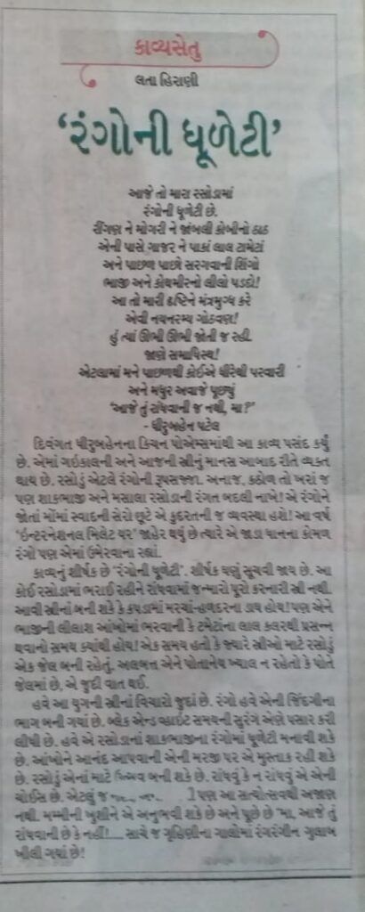 કાવ્યનું શીર્ષક છે ‘રંગોની ધૂળેટી’. શીર્ષક ઘણું સૂચવી જાય છે. આ કોઈ રસોડામાં ભરાઈ રહીને રાંધવામાં જન્મારો પૂરો કરનારી સ્ત્રી નથી. આવી સ્ત્રીનાં બની શકે કે કપડામાં મરચાં-હળદરના ડાઘ હોય! પણ એને ભાજીની લીલાશ આંખોમાં ભરવાની કે ટમેટાંના લાલ કલરથી પ્રસન્ન થવાનો સમય ક્યાંથી હોય! એક સમય હતો કે જ્યારે સ્ત્રીઓ માટે રસોડું એક જેલ બની રહેતું. અલબત્ત એને પોતાનેય ખ્યાલ ન રહેતો કે પોતે જેલમાં છે, એ જુદી વાત થઈ.